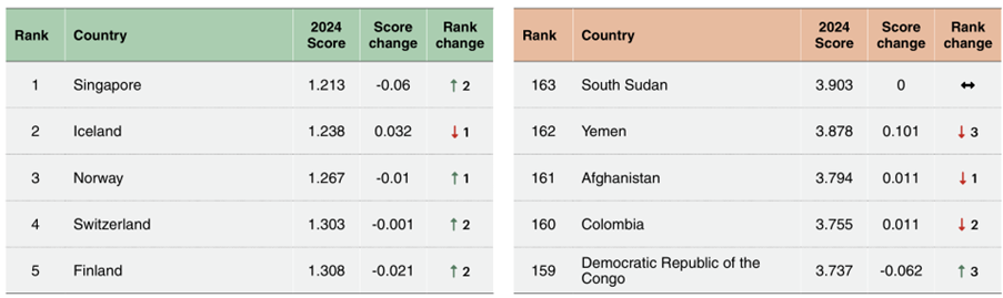 Five Most & Least Safe Countries by Safety and Security Domain (2024)