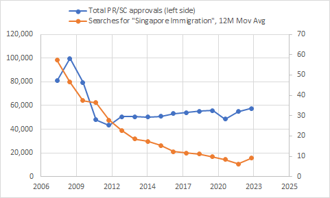 Chart 1: Singapore residency approvals vs Google searches for “Singapore immigration”