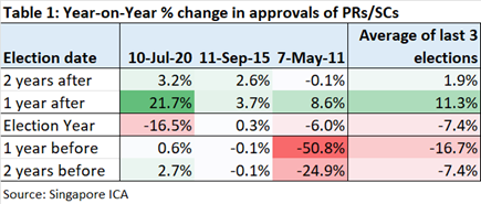 As we can see from the table below there is a tendency for approvals of Singapore residency (PR/SC) to decline up to 2 years before the year of the General Elections.